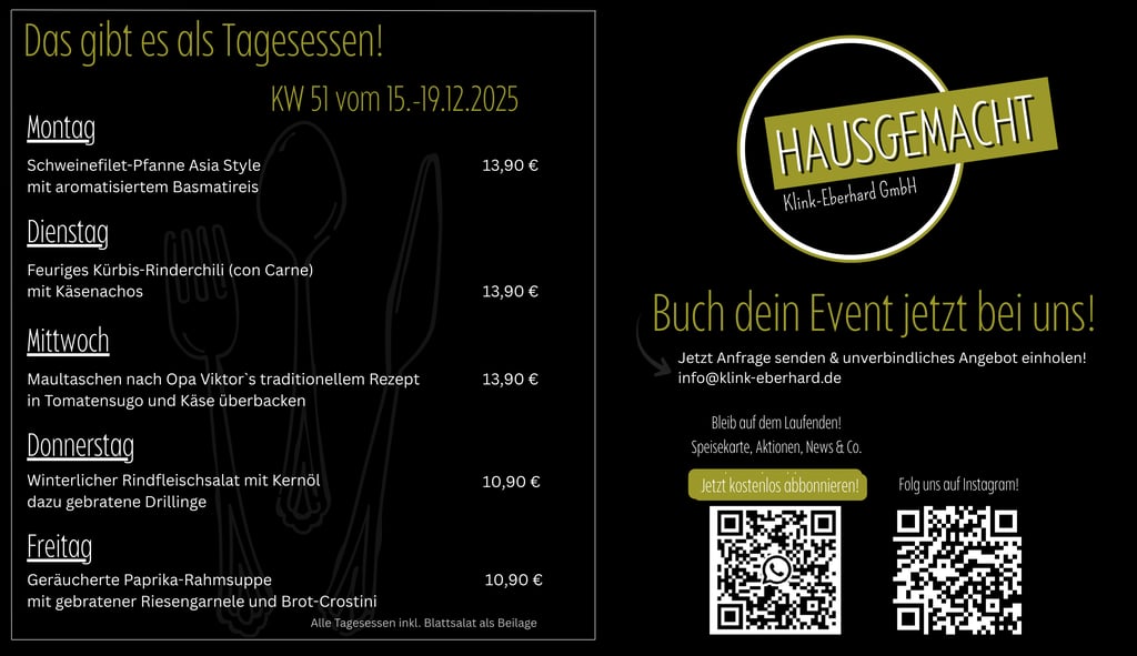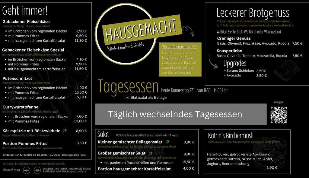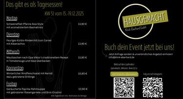 Wir sind kein typischer Imbiss mit Pommes rot weiß. Unser täglich wechselnder Mittagstisch bringt Abwechslung auf den Teller: hausgemachtes Essen wie bei Oma, mit frischen Zutaten aus der Region und einer Portion Kreativität. Wir zaubern daraus die perfekte Mittagsmahlzeit – sättigend, ehrlich und mit ganz viel Liebe gekocht. So schmeckt Pause, die satt macht und glücklich!