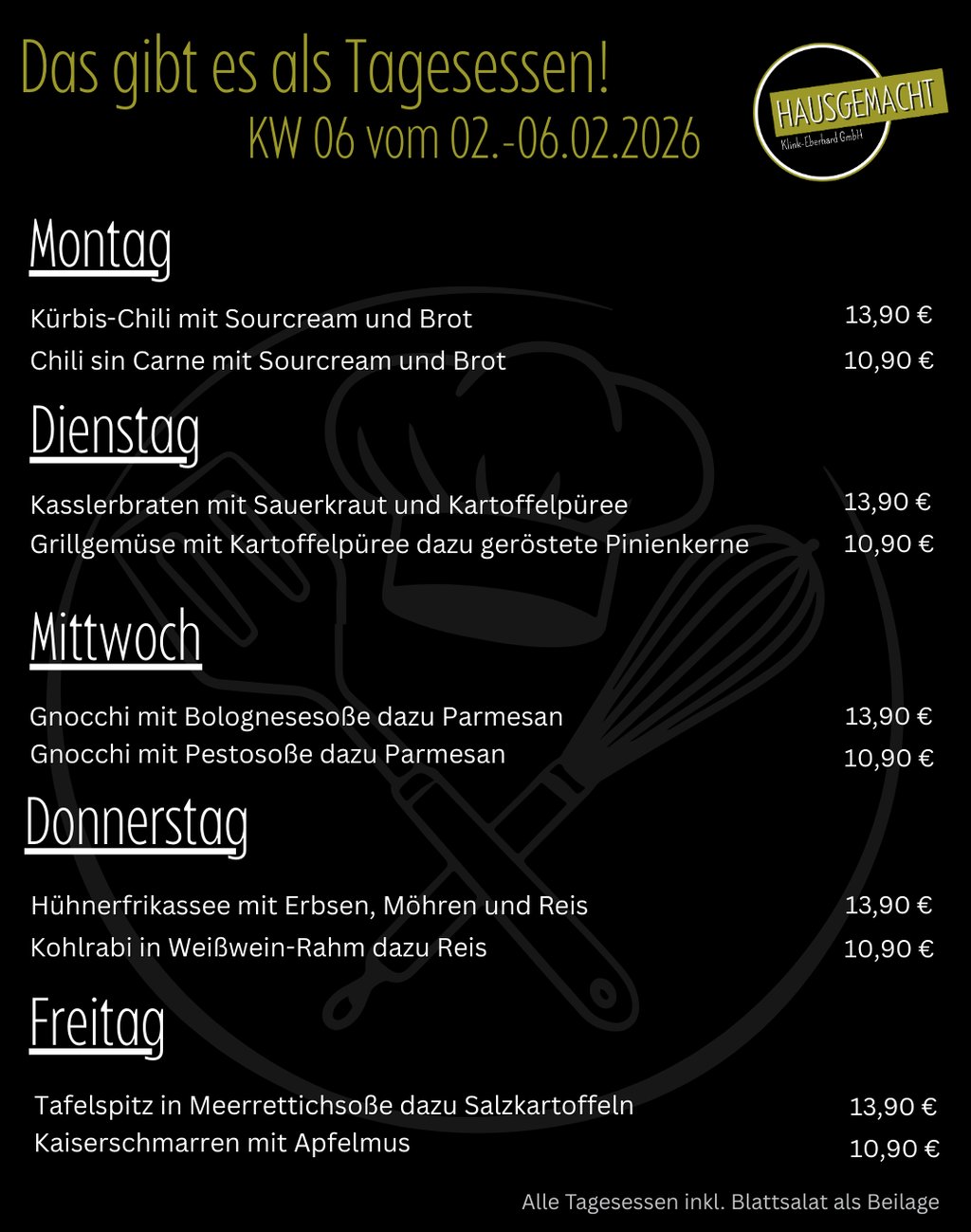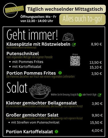 Auf unserer Webseite präsentieren wir dir stolz unsere aktuelle Speisekarte. Da wir saisonal kochen, ändert sich unser Angebot ständig – Langeweile auf dem Teller gibt es bei uns nicht. Damit du aber garantiert kein Highlight mehr verpasst, haben wir einen besonderen Service für dich eingerichtet: Unseren WhatsApp-Kanal.